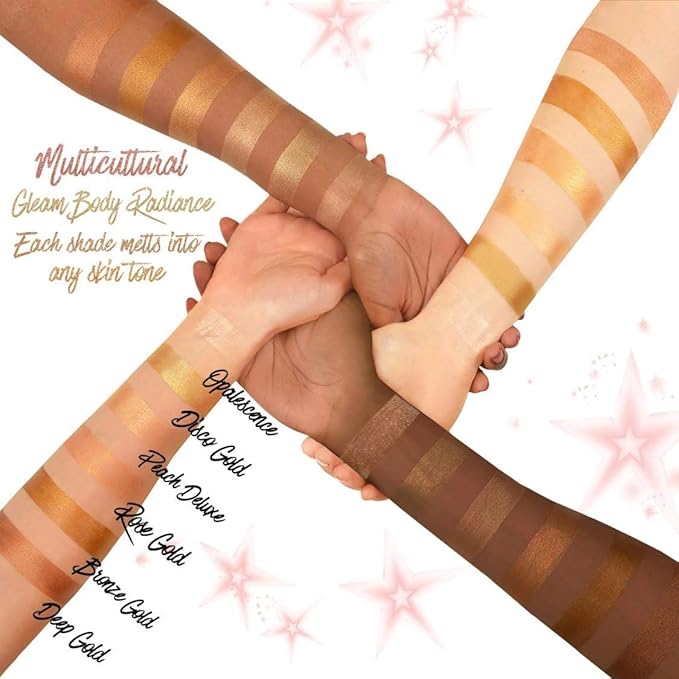 - ROSE GOLD: Rose Gold is the signature shade that started it all and is perfect for all skin tones giving a golden sun kissed glow with hints of pink undertones. Use as a primer for face & highlighter or all over body for perfected glowing skin. Gleam’s lightweight moisturizing makeup will help diminish minor imperfections while hydrating skin and improving skin appearance.