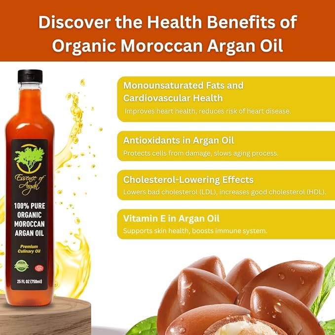 Essence of Argan Organic Moroccan Argan Oil for Cooking, Vegan Eco-Certified USDA-Approved Natural Argan Oil, Great Culinary Oil and Keto Dressing Rich in Nutrients, 25 Ounces