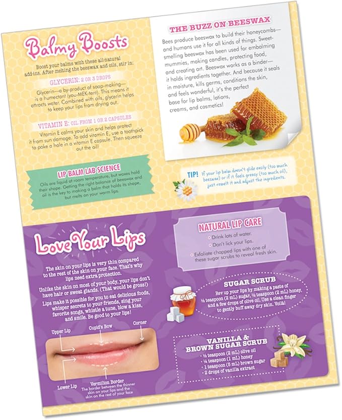 - The Beauty-Based Chemistry Kit Includes Six Lip Balm Containers One Lip Balm Mold One Lotion Bar Mold With Four Shapes One Gift Bag Sticker Sheet Six Lotion Bar Gift Bags 42.2 Grams Beeswax Pastilles And Instruction Pamphlet