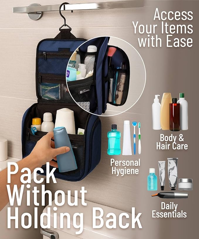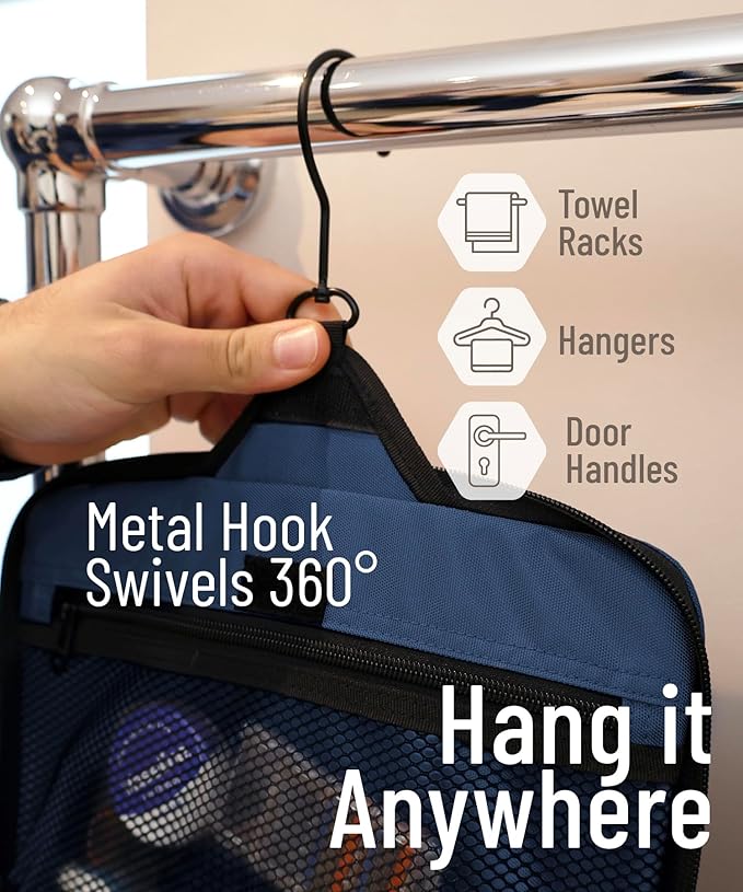 - Convenient Hanging Hook: The XXL metal swivel hook allows you to hang the bag anywhere, saving valuable counter space. It's perfect for use in hotels, bathrooms, or even on a camping trip.