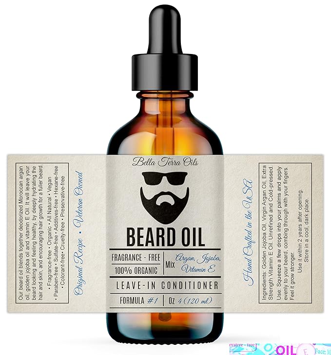 Bella Terra Oils - Beard Oil 4oz - Crafted with Genuine Natural Organic Vitamin E, Organic Jojoba & Argan, Classic Anti-Friz Formula, Elevating Beard Luster & Care
