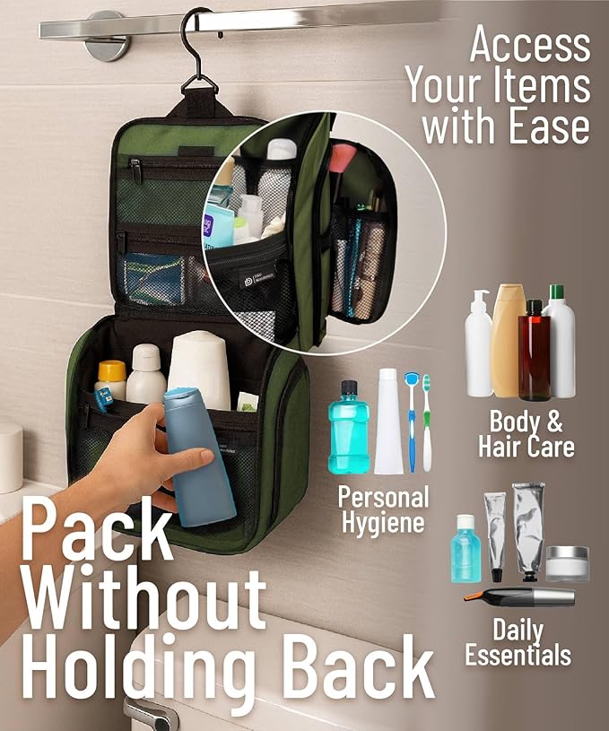 • Convenient Hanging Hook: The XXL metal swivel hook allows you to hang the bag anywhere, saving valuable counter space. It's perfect for use in hotels, bathrooms, or even on a camping trip.