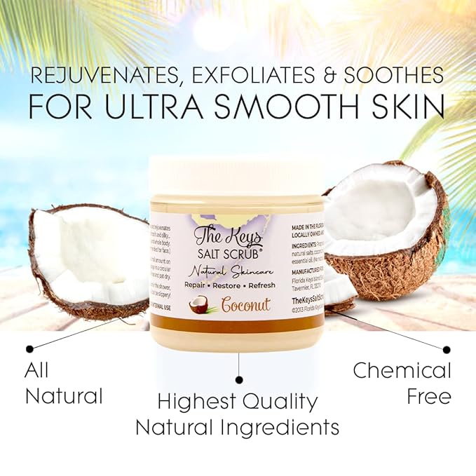 - GET ULTRA-SMOOTH SKIN FAST: Transform your skincare routine with The Keys Salt Scrub, an all-natural, chemical-free exfoliating body scrub that leaves skin feeling soft and rejuvenated. Infused with Florida sea salt and organic coconut oil, this body scrub not only smells amazing but also regenerates your skin, improving texture and tone. The foot scrub for pedicures, hand scrub for manicures, and gentle face scrub for women, offer a luxurious treatment that leaves your skin soft and silky.