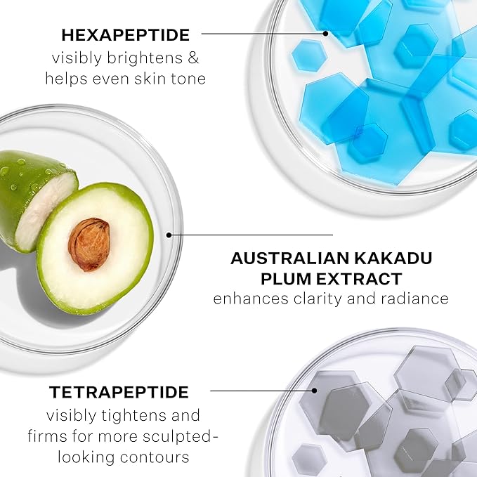- Hexapeptides, vitamin C-rich Australian Kakadu Plum Extract and naturally-derived brighteners