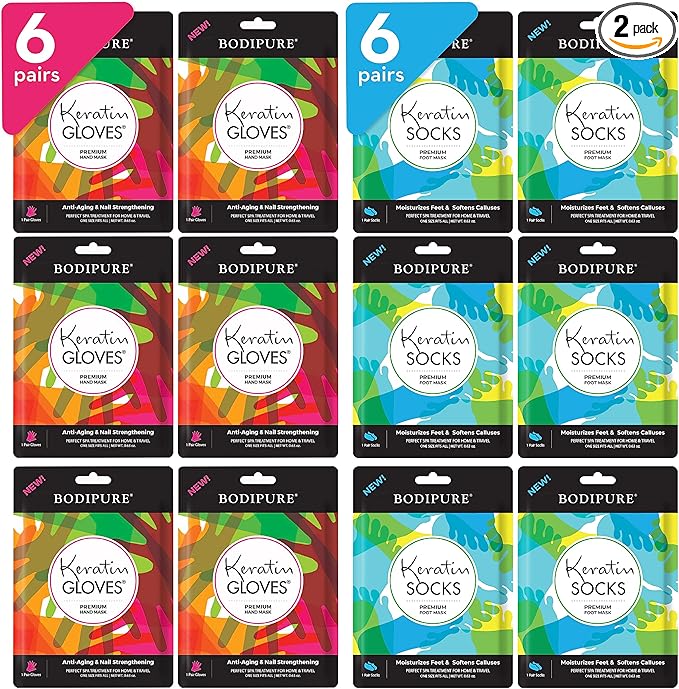Bodipure Premium Hand and Foot Mask | Moisturizing Kertain Gloves & Socks | Hydrating Dull Dry Hands, Cracked Heels, Callus Softening & Nail Strengthening | Chemical-Free Feet Treatment | (6+6 Pack)