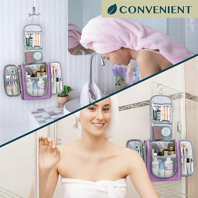 - COSMETICS TRAVEL BAG ORGANIZER: This toiletry bag for women has a hanging hook and multiple pockets that help you stay organizer during business trip, vacation travel. The hanging hook makes it easy to hang the toiletry bag to bars in the hotel shower bathroom. Unzip your toiletry bag to reveal compartments to organize your shampoo, skincare face hygiene products. This toiletry travel bag is an essential accessory for cruise in Europe, plane, Hawaii Trip, and honeymoon.