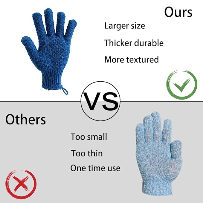 - 🚿EXTENDED BATH GLOVES - We have made a comprehensive upgrade of bath shower gloves, increasing the length and width of the gloves, which is 10% longer than ordinary Exfoliating gloves. The shape of the convex points on the surface of the gloves greatly improves the effect of exfoliation