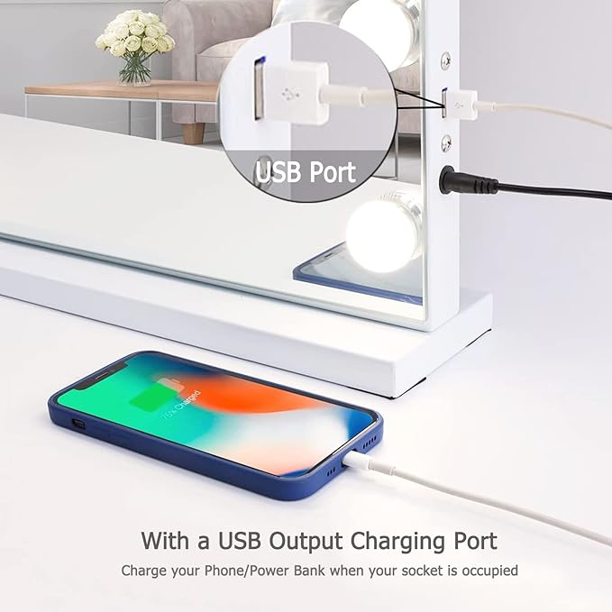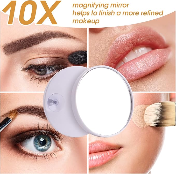 - 【 Convenient Features】10X magnifying mirror is detachable and has suction cups on the back, it is great for plucking eyebrows and applying eye or mouth makeup etc. USB Output Charging on the side of the lighted vanity mirror can charge your phone/iPad.