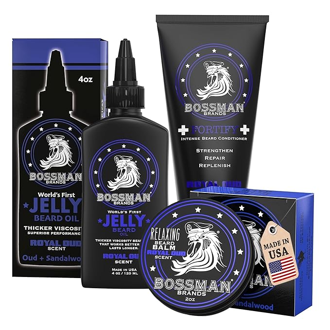- 3-Piece Beard Treatment: Our beard care kit includes the Fortify Intense Beard Conditioner, Jelly Beard Oil, and Relaxing Beard Balm. The combo of these three Bossman beard products is designed to moisturize hair and skin, promote strength and growth, and train unruly beards.