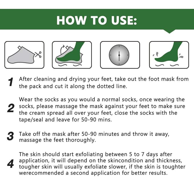 - Baby Soft Skin Foot: Wear foot peel mask on your feet for 50-90 minutes and then remove it. The dead skin on the feet will fall off and the skin so soft like baby foot