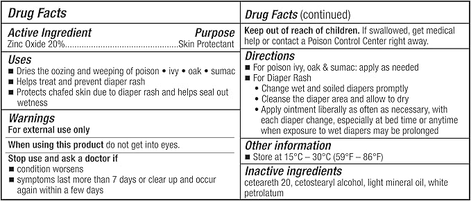 - ZINC OXIDE: Active Ingredient Zinc Oxide 20% provides relief and treatment of diaper rash, chafed skin, and dries the oozing and weeping of poison ivy, oak and sumac.