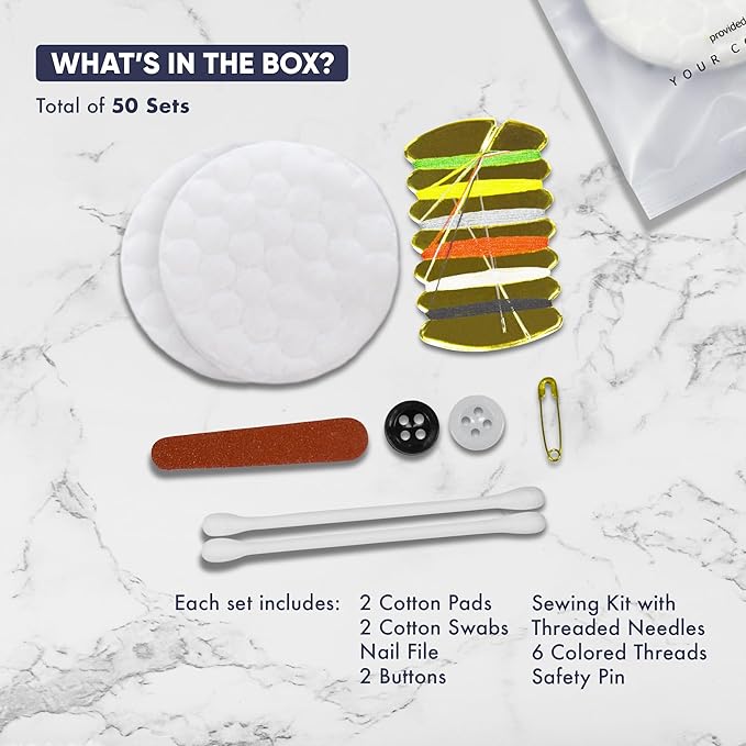 - INCLUDES: Hospitality Size Generic Personal Care Kit 2 Cotton Pads, 2 Cotton Swabs, Nail File And Sewing Kit With 2 Threaded Needles, 4 Color Thread, Safety Pin And 2 Buttons