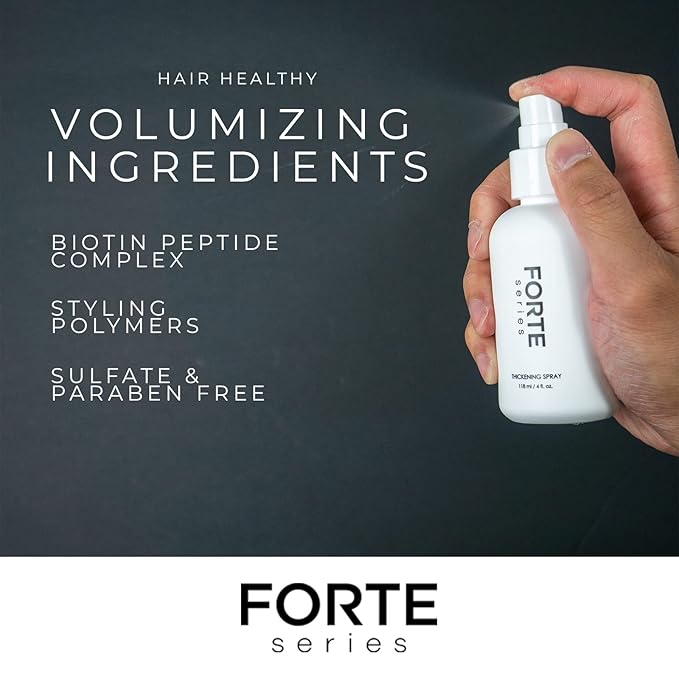 - HAIR THICKENING SPRAY - Effortlessly add volume to your hair with the help of the Thickening Spray by Forte Series. This hair volume spray is formulated with a special biotin peptide complex and styling polymers to temporarily “lift” flat hair and plump hair strands from the inside out.
