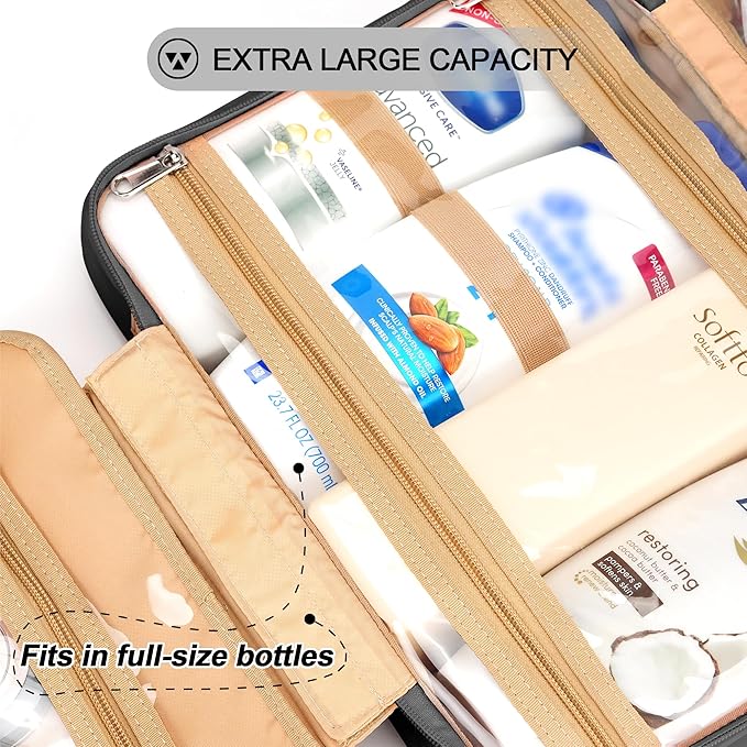 - PATENT PENDING GREAT ORGANIZER MASTER - This wash bag is designed with 4 toiletry storage compartments and a special jewelry compartment, you can easily put your wash products and jewelry separately to make your journey organized. The size of the fully-loaded state is 12.5''L x 10''H x 4.5''W, the 2 main compartments can hold up to 8 full-sized toiletries and cosmetics at the same time, no worries for long-distance travel.