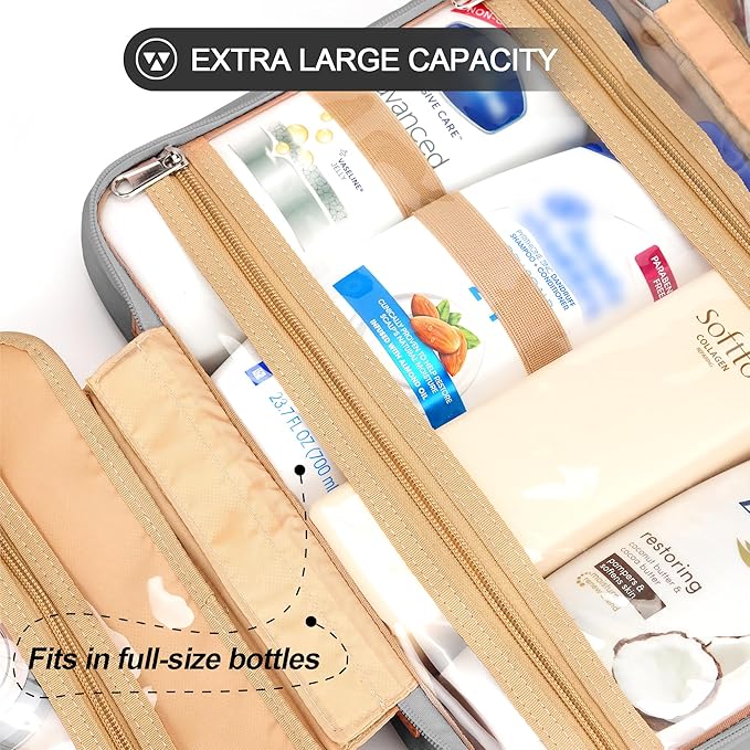 Travel Hanging Toiletry Bag for Women, Holds Full-Size Shampoo, with Jewelry Organizer Compartment, Extra Large Makeup Bag, Waterproof Cosmetic Bag, Toiletries Kit Set with Trolley Belt, Grey