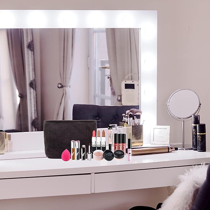 PAZIMIIK Makeup Bag Large Zipper Corduroy Make Up Pouch for Purse Travel Canvas Cosmetic Organizer for Women Brush Storage,Black