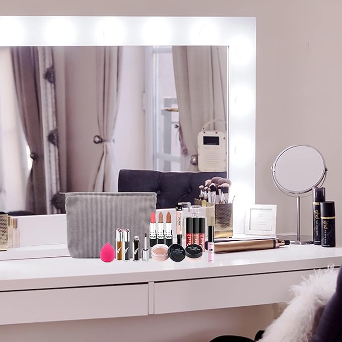 PAZIMIIK Makeup Bag Large Zipper Corduroy Make Up Pouch for Purse Travel Canvas Cosmetic Organizer for Women Brush Storage,Grey
