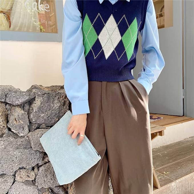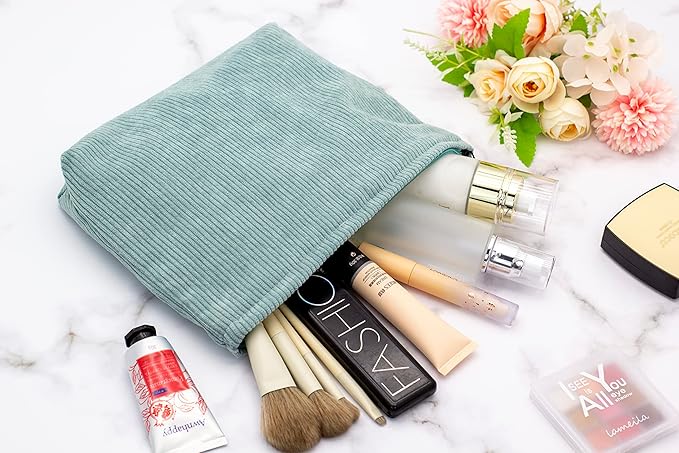 PAZIMIIK Makeup Bag Large Zipper Corduroy Make Up Pouch for Purse Travel Canvas Cosmetic Organizer for Women Brush Storage,Blue