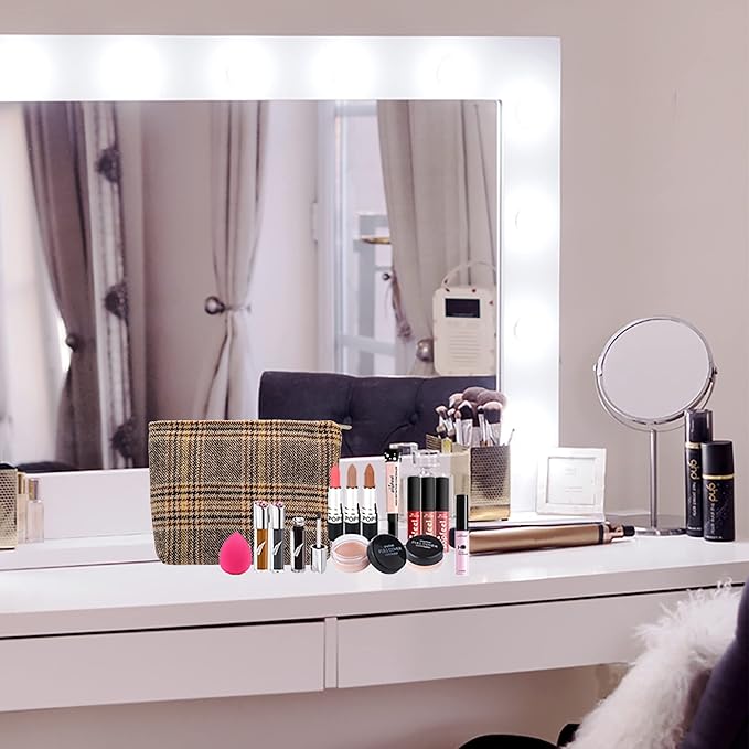 Makeup Bags for Purse Zipper Cosmetic Pouch Large Travel Canvas Make Up Organizer Tool Pouch for Women and Girls,Plaid Brown