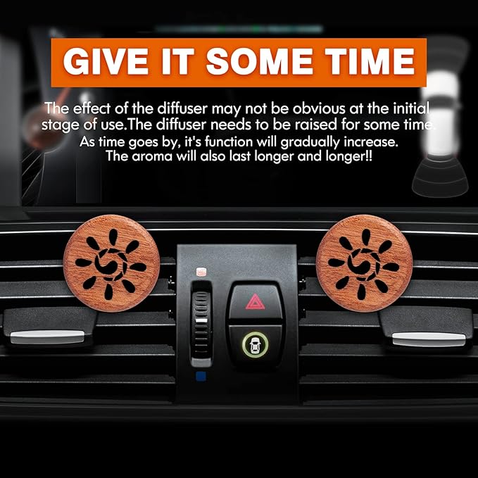 - DRIP YOUR ESSENTIAL OIL ON THE TOP: No need to Loosen the cover. Just drip 4 drops of your favorite essential oil on top of the wood and wait for the essential oil to be absorbed, then clip it on the exhaust hole of car air conditioner by the vent clip. Then you will smell the scent of your favorite essential oil in the car. Because of made of wood, when you want to tighten the lid, please do not be too hard.