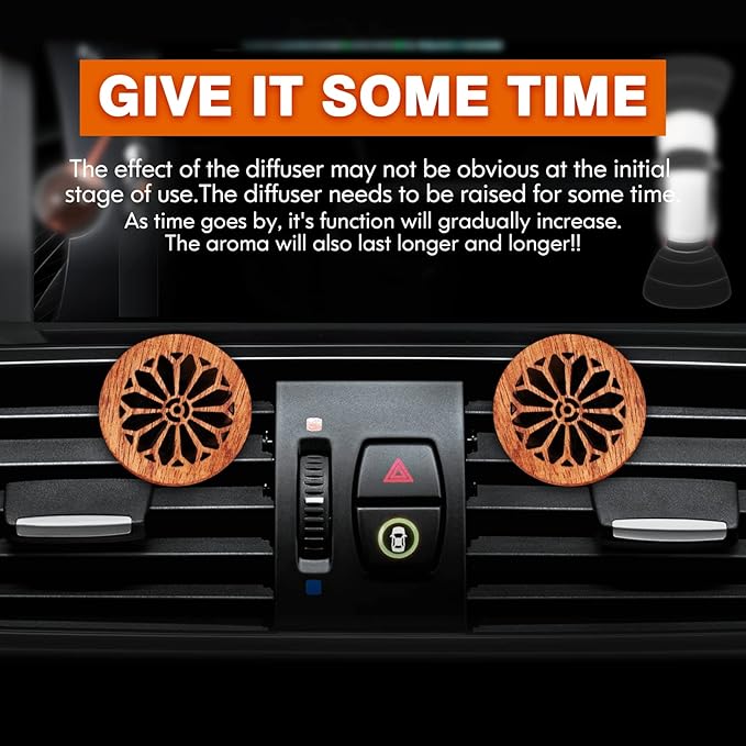 - DRIP YOUR ESSENTIAL OIL ON THE TOP: No need to Loosen the cover. Just drip 4 drops of your favorite essential oil on top of the wood and wait for the essential oil to be absorbed, then clip it on the exhaust hole of car air conditioner by the vent clip. Then you will smell the scent of your favorite essential oil in the car. Because of made of wood, when you want to tighten the lid, please do not be too hard.