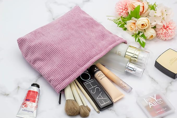 PAZIMIIK Makeup Bag Large Zipper Corduroy Make Up Pouch for Purse Travel Canvas Cosmetic Organizer for Women Brush Storage,Pink