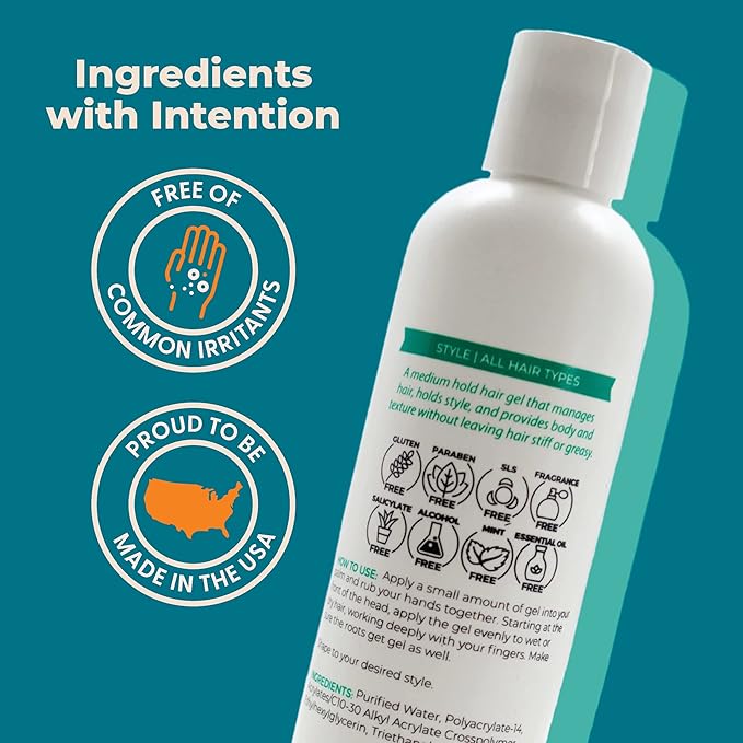 - Clean Hair Styling Gel - Gently curated for sensitive skin and sensitive scalps as its free of common irritants like essential oils, harsh chemicals, dyes, gluten, or salicylates that can cause dryness, flakes, itching, and flare ups from skin conditions or scalp irritation