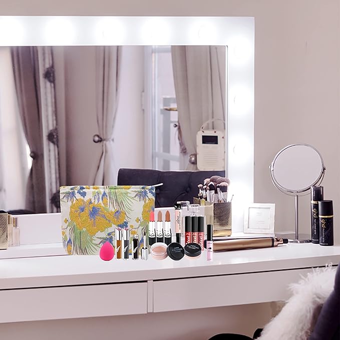 Makeup Bags for Purse Zipper Cosmetic Pouch Large Travel Canvas Make Up Organizer Tool Pouch for Women and Girls,Brocade Flower Yellow