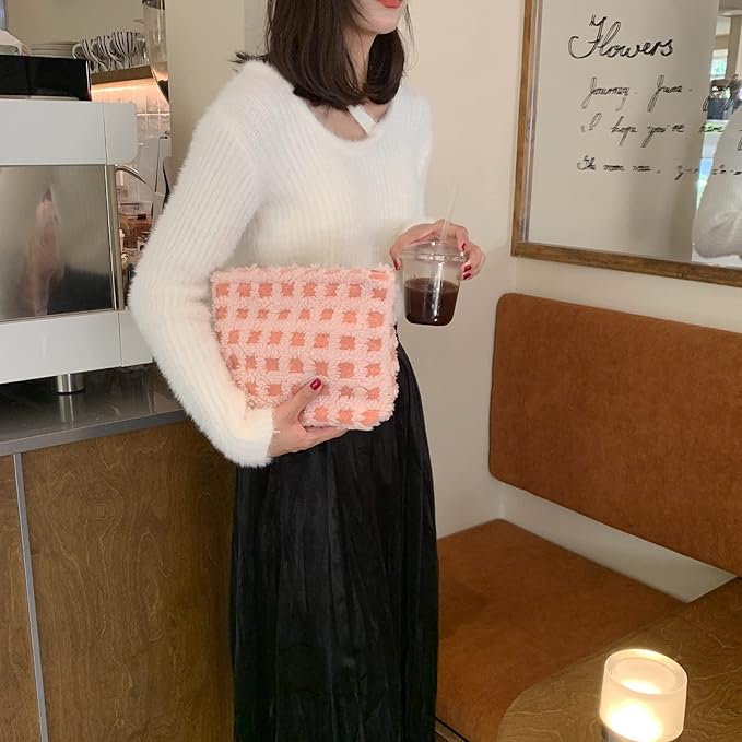 Makeup Bags for Purse Zipper Cosmetic Pouch Large Travel Make Up Organizer Tool Pouch for Women and Girls,Fleece Pink