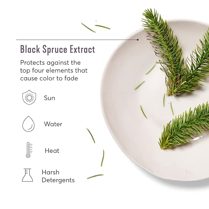 - BLACK SPRUCE EXTRACT: Contains a powerful antioxidant that protects against the top four elements that cause color to fade: sun, water, heat, and harsh detergents