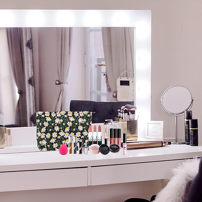 Makeup Bags for Purse Zipper Cosmetic Pouch Large Travel Canvas Make Up Organizer Tool Pouch for Women and Girls,Daisy Black