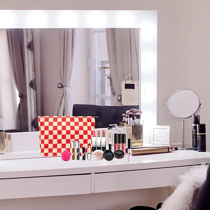 PAZIMIIK Makeup Bag Large Zipper Corduroy Make Up Pouch for Purse Travel Canvas Cosmetic Organizer for Women Brush Storage,Checkered Red