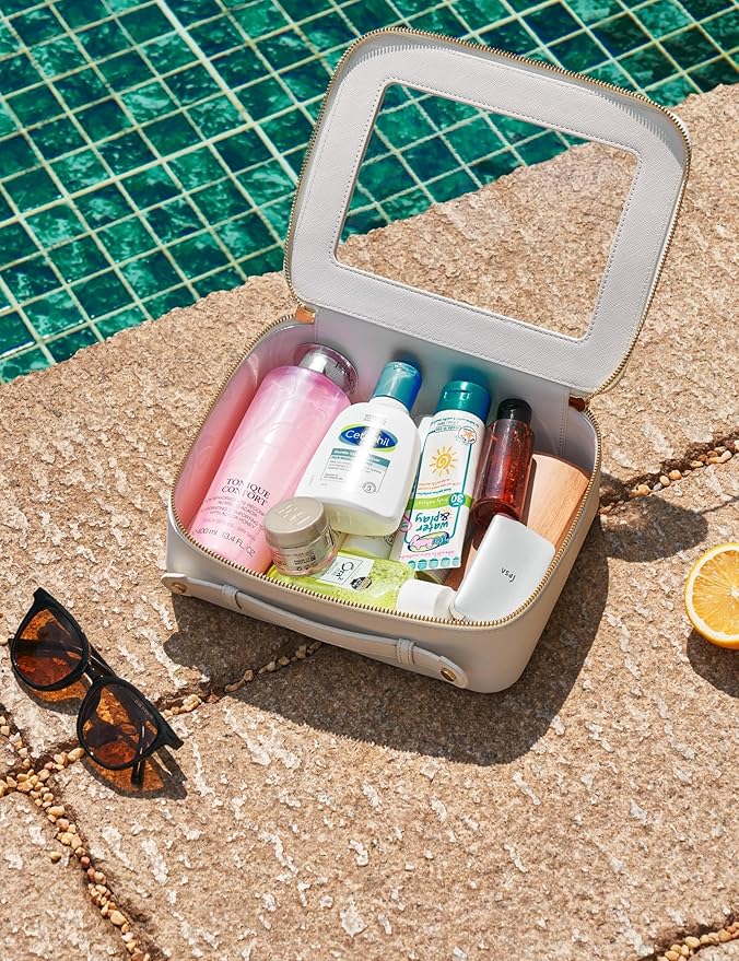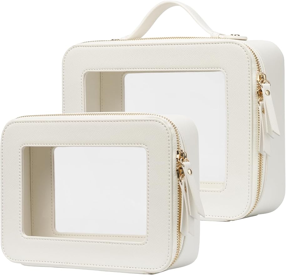 - [Premium Material and Durability] – The clear cosmetic case, both the exterior and interior, is crafted from high-grade saffiano faux leather, which is highly scratch resistant, durable and exceptionally easy to keep clean. It features a smooth zipper for secure closure, and elegant light gold metal hardware accents, adding a luxurious and sophisticated touch to the bag's overall design.
