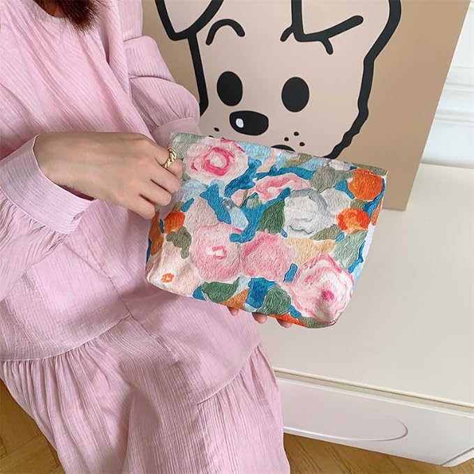 PAZIMIIK Floral Makeup Bag Large Cotton Zipper Pouch for Purse Travel Canvas Make Up Organizer for Women Cosmetic,Garden Orange