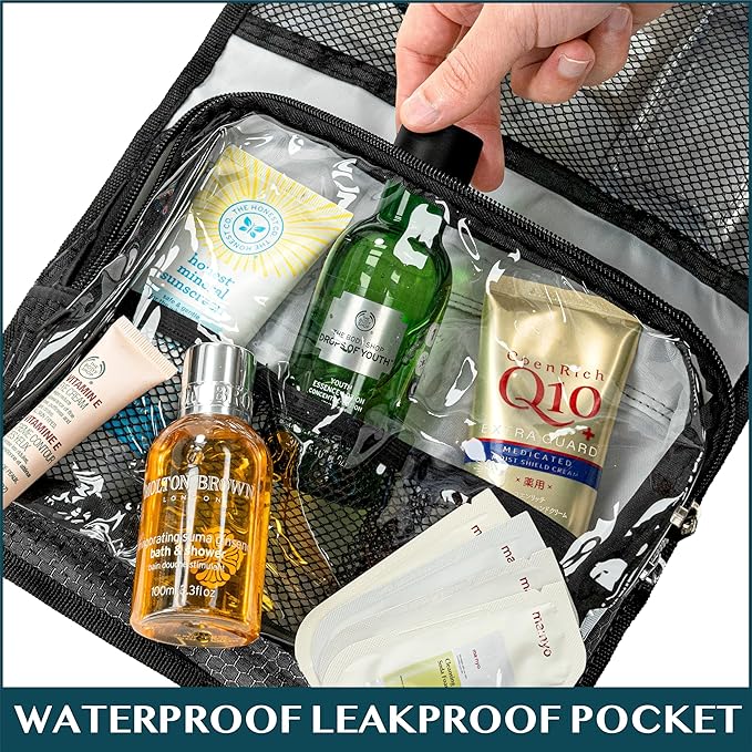 - PADDED MAKE UP BAG KIT: The toiletry case bag for men has foam padding that protects toiletries container, shampoo bottle during flying, roadtrip, and plane. The toiletry bag kit also has elastic bands that secure makeup brush, face spray, lipstick, shaving razors. One waterproof compartment for wet toiletries. Clear pockets let you see all essentials clearly and is tsa approved. This large hanging toiletry bag holder for women will protect all gear, cosmetics, and travel gadgets.