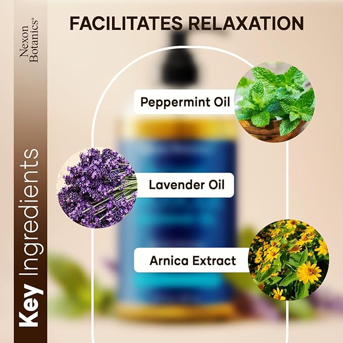 Sore Muscle Massage Oil for Massage Therapy 8 fl oz - Refreshing and Relaxing - Natural Oils with Arnica, Peppermint and Lavender Oil - for Men and Women - Nexon Botanics