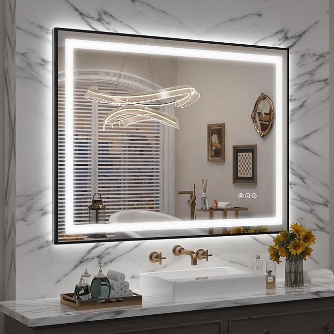 - Matte Black Metal Frame LED Light Mirror: Unlike other no frame mirrors, our LED mirror for bathroom have thin and durable black metal frame that provides sufficient brightness and elegance look. It combines practicality and modern beauty, is a ideal for decorating bathroom, living room, bedroom, hair salon and hotel.
