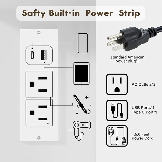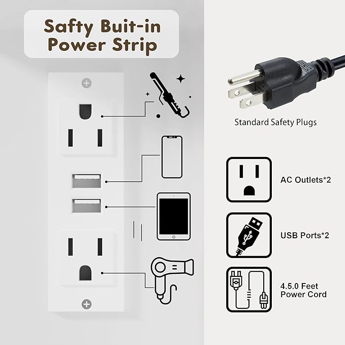 - Power Outlet: The vanity bench is equipped with two sockets and two USB ports. It provides great convenience for charging your phone or other electronic device.