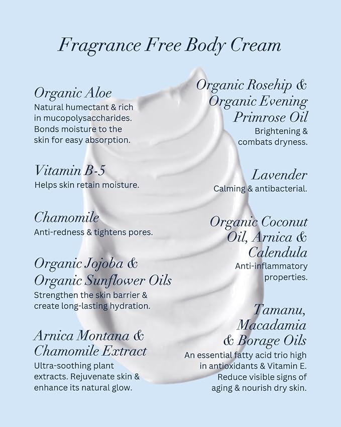 - Our Fragrance Free Body Cream is formulated with natural ingredients to deeply moisturize and nourish your skin, leaving it feeling soft, supple, and rejuvenated.