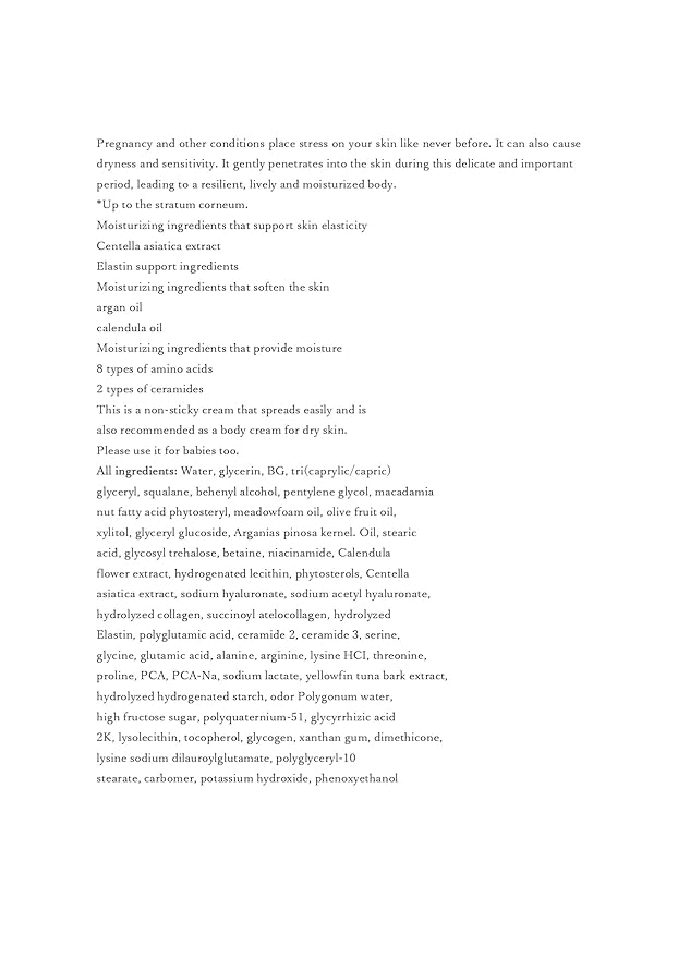 - 【Moisturizing for Dry Skin】 A body cream born from the collaboration of midwives and experienced moms. It's a fragrance-free, color-free, and gentle formula, perfect for Japanese expectant mothers. Its ease of use without the need for massage is one of its appealing features. With its high moisturizing power, it's also great as a body cream for combating dryness.