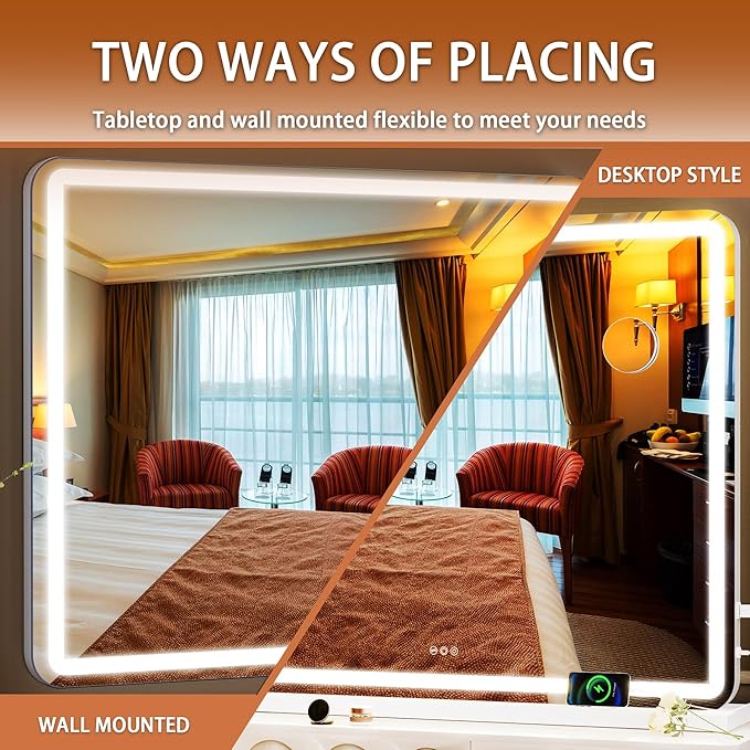 - 👍【Smart Touch Control & Memory Function】This makeup mirror with lights has 3 smart touch buttons, turn on/off the light by touching the sensor switch, Press left button to change the color modes, long press right button to adjust the led brightness. This lighted makeup mirror is specially designed memory functionfunction keep your lights setting like your last use.