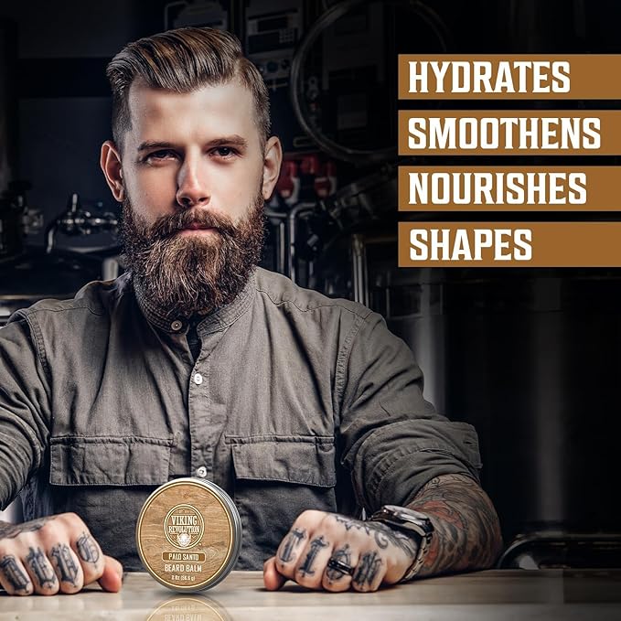 Viking Revolution Palo Santo Beard Balm for Men - Beards Butter for Men with Argan Oil and Jojoba Oil - Beard Softener and Moisturizer for Mens Beards Styling Balm (1 Pack, 2oz)