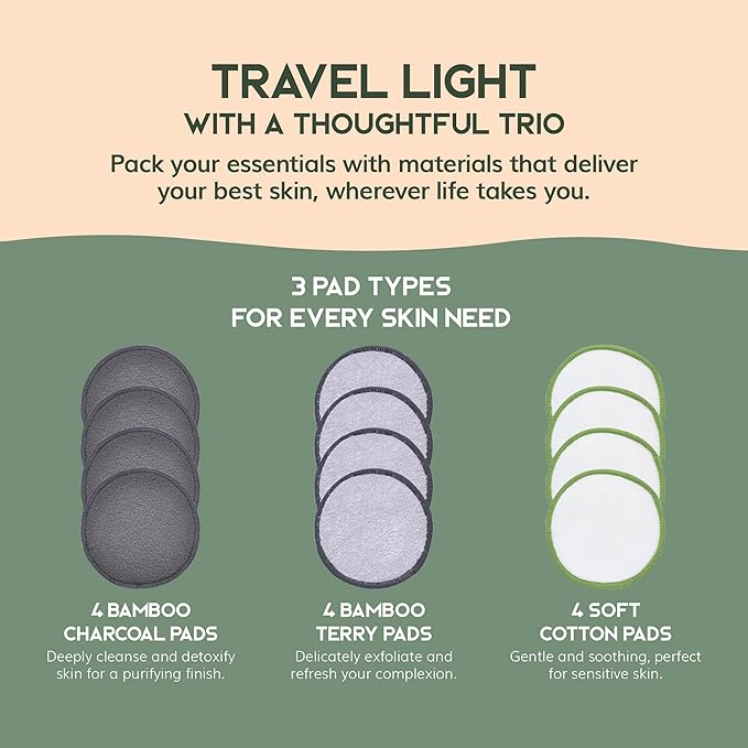 - Great Skin On the Go. Our reusable pads travel set includes 4 bamboo terry, 4 bamboo charcoal, and 4 soft reusable cotton pads. From cleansing to exfoliation, these reusable makeup remover pads help you achieve flawless, glowing skin on the go.