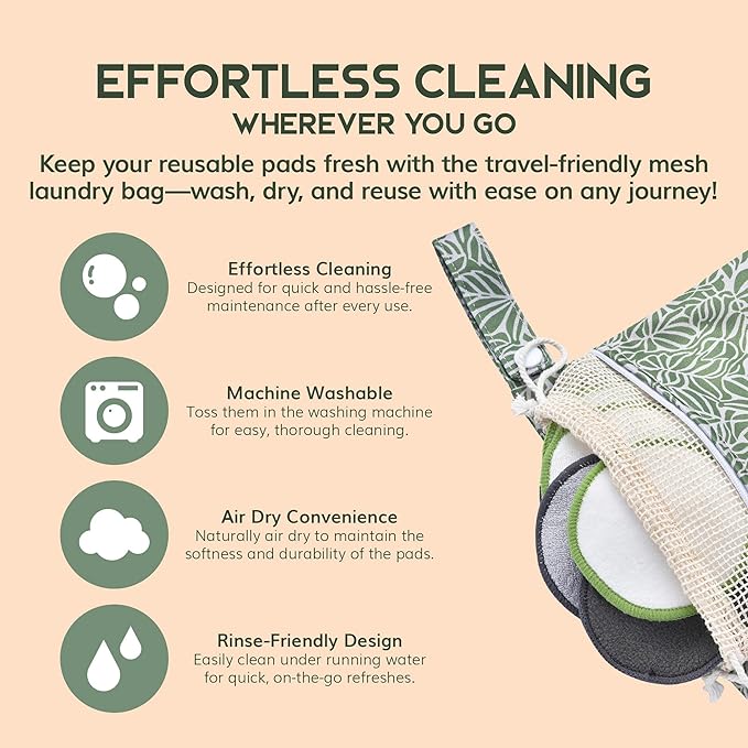 - Convenient Care for Sustainable Beauty. Our travel must have reusable makeup remover wipes also come with a durable mesh laundry bag. Experience convenient washing and faster drying wherever you go while keeping your pads protected during washes.