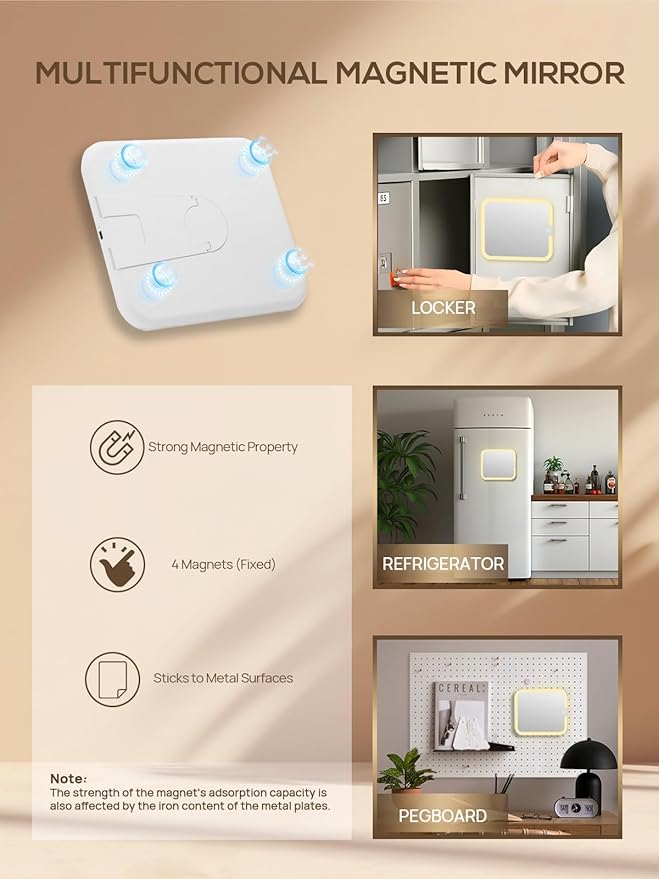 - 【Removable Travel Mirror】This travel mirror with light is built-in 4 strong magnets. Unique design making them easy to install, which can be applied directly to anywhere ironwork surfaces. Great fits for various makeup occasions: school locker, office, bookshelf, etc