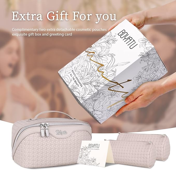 - Exquisite packaging: This travel make up bags for women comes beautifully packaged in an exquisite gift box, with a thoughtfully designed greeting card. It will be a great gift for ladies on Valentine's Day, Mother's Day, Birthdays, Christmas,Thanksgiving Day, Anniversary Day and more.