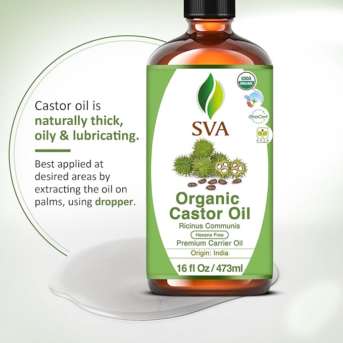 - Premium High-Quality Organic Castor Carrier Oil: SVA Castor Oil is obtained by cold-pressed extraction of Ricinus Communis seeds. Our Castor oil is Hexane-free and free of preservatives, Our Organic Castor oil comes with a pump for easy application. It is not tested on Animals. We care for you.