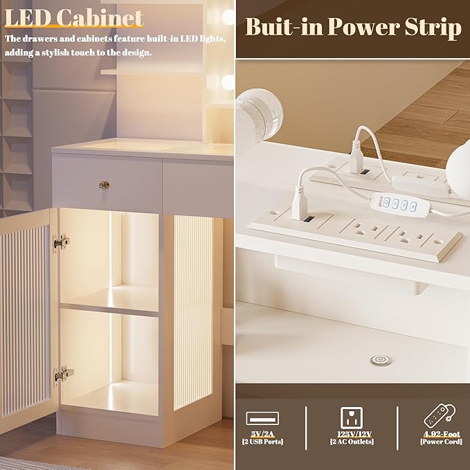 - 【Built-in Charging Station and Hair Dryer Stand】vanity with lights includes 2 standard electrical outlets, 2 USB ports, and a dedicated hair dryer stand, allowing you to conveniently connect and charge your hair tools, smartphones, tablets, and other devices.Stay organized and worry-free with our multifunctional girls vanity.