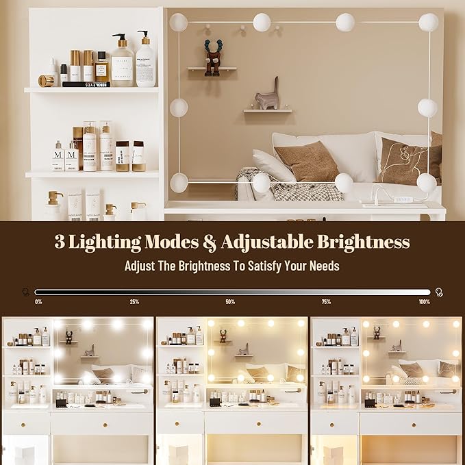 - 【Vanity Set with Large Mirror and LED Lights】This makeup vanity desk with lights features a large mirror with 10 Hollywood-style LED bulbs. Choose from 3 color modes (warm yellow, warm white, and cool white) and adjust the brightness settings to create the perfect lighting for your makeup needs. Ideal for home, work, hair salons, and studio makeup applications.