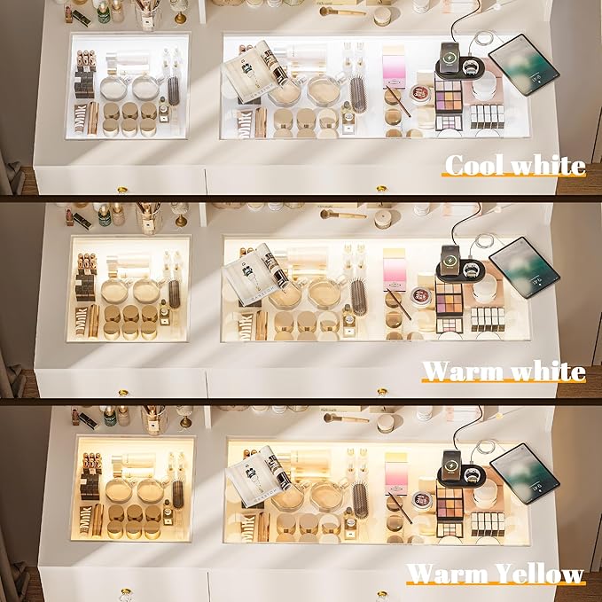 - 【Glass Top Vanity with RGB Drawers】white vanity desk is designed with a transparent tempered glass tabletop, you can easily see everything inside the vanity drawers. The built-in LED lights feature three color temperature modes, adding a touch of brightness and style to any room.